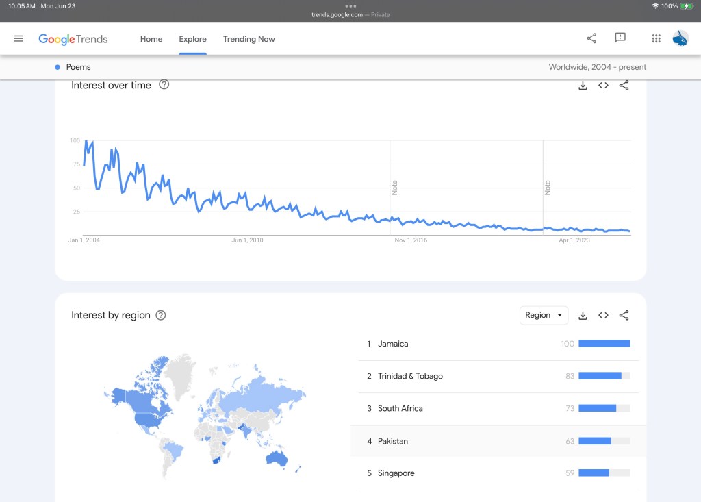 There has been a worldwide downward trend in Google searches for “poems” since 2004 – 2025.
